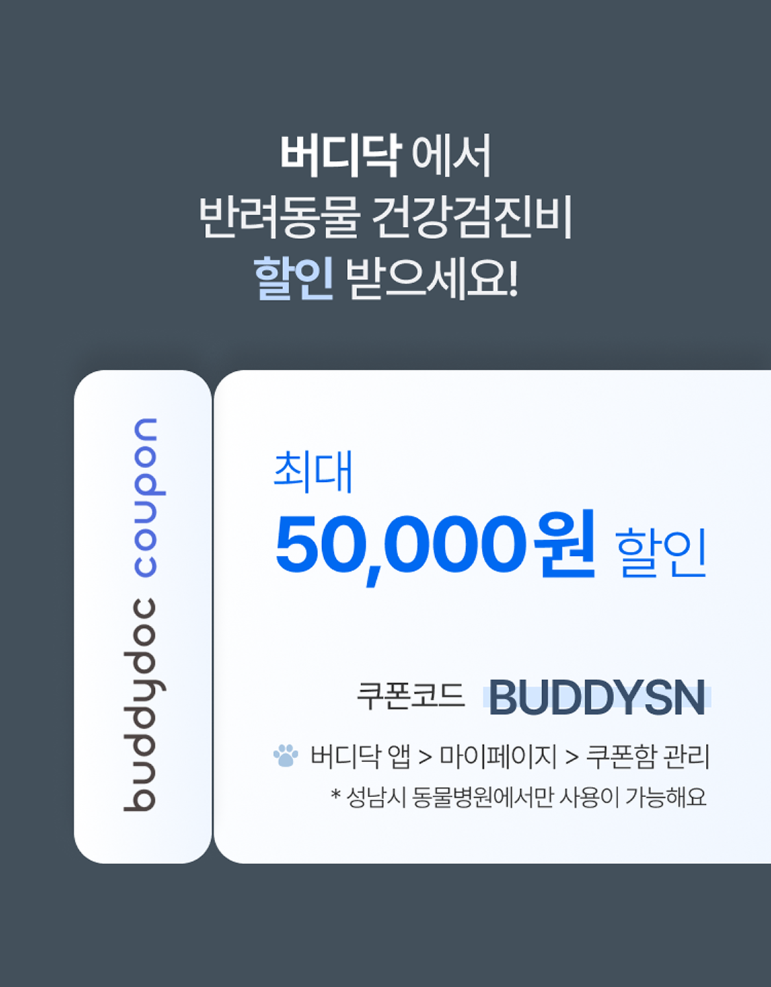 ![]() | 최대 5만원 할인 성남시 버디닥 제휴 동물병원에서 사용 가능한 검진 할인권 제공 |